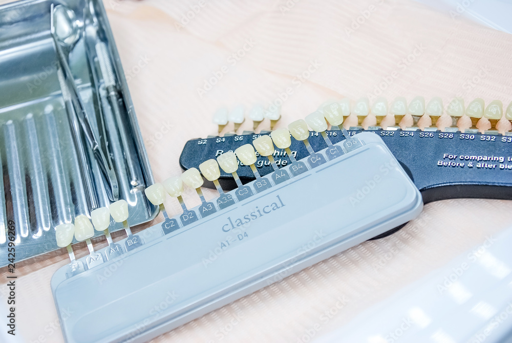 Dentist Clinic Chart Of Acrylic Teeth Tooth Color Chart Dentist Office Teeth Care And Tooth Health Concept Teeth Color Samples Whitining Teeth Dental Instrument For Selecting Color Of Teeth Tooth Stock Photo Adobe Stock